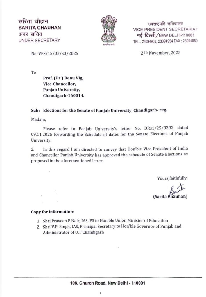 ਕੇਂਦਰ ਨੇ ਵੀਸੀ ਦੁਆਰਾ ਤਿਆਰ ਕੀਤੇ ਸ਼ਡਿਊਲ ਅਨੁਸਾਰ ਸੈਨੇਟ ਚੋਣਾਂ ਨੂੰ ਪ੍ਰਵਾਨਗੀ ਦਿੱਤੀ