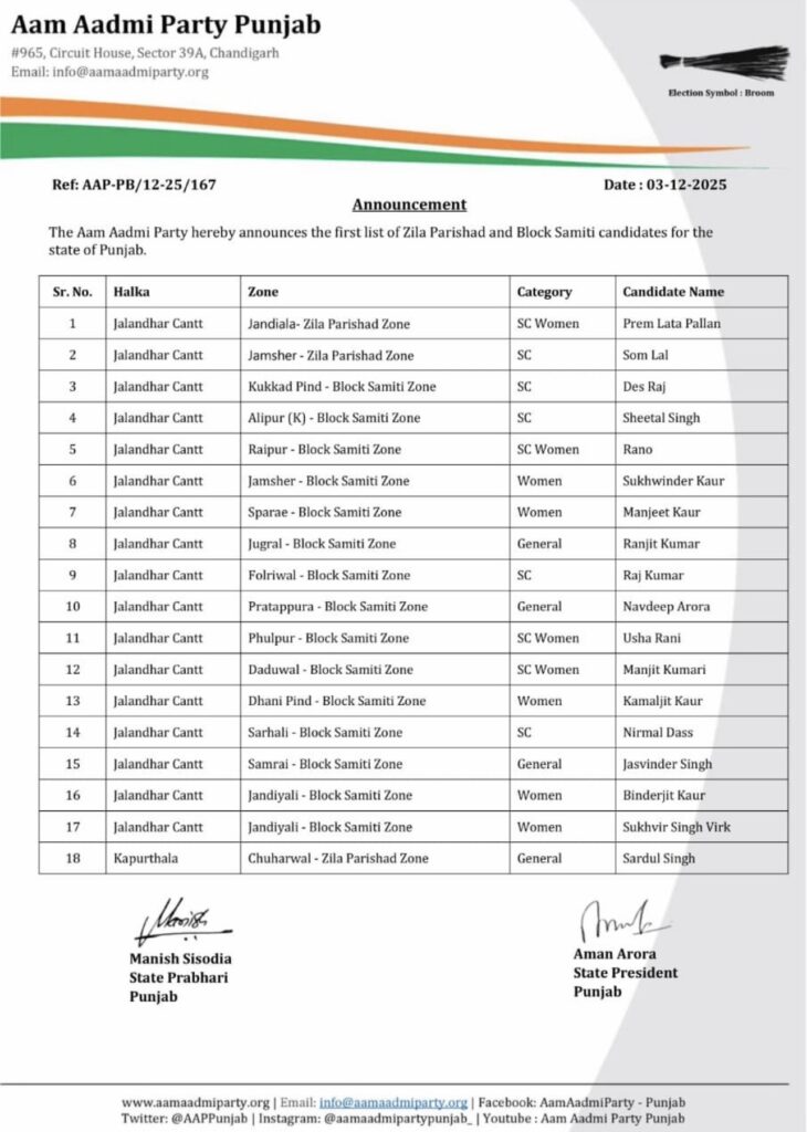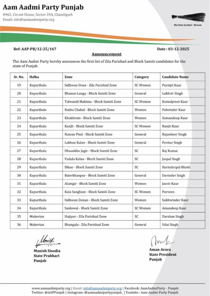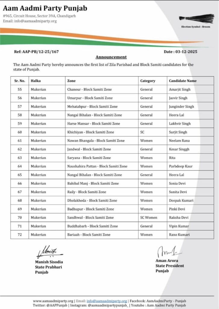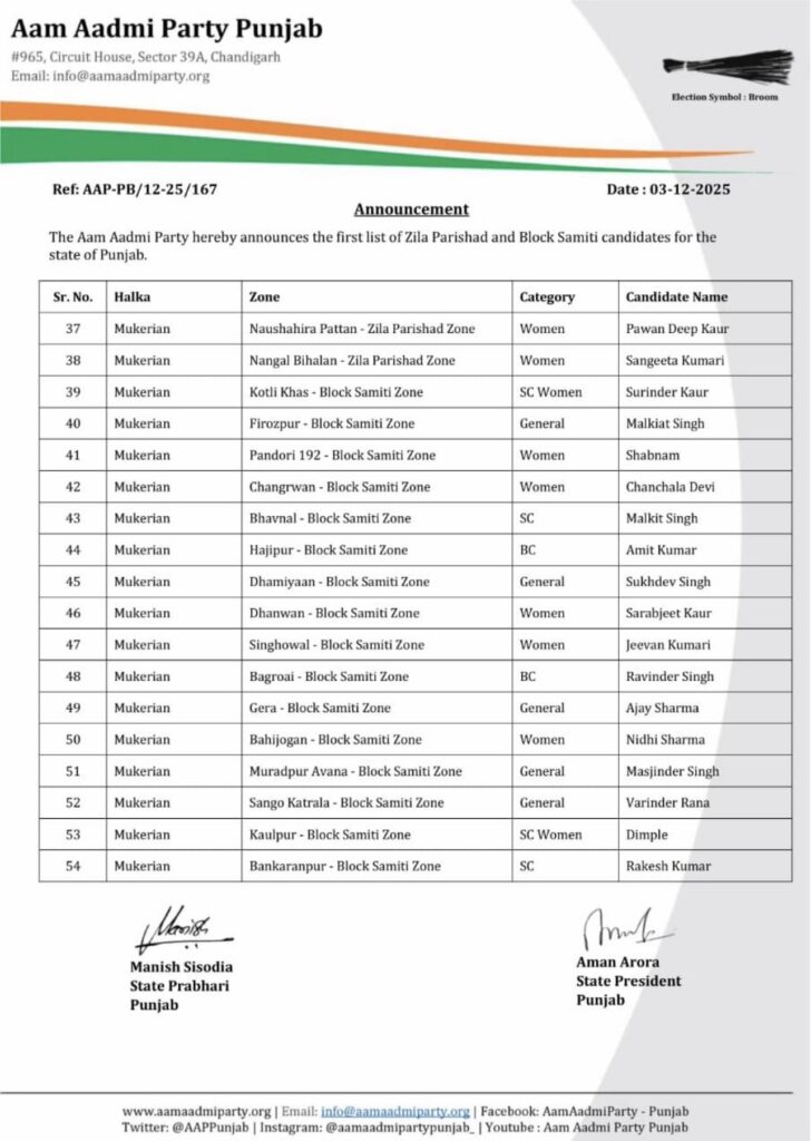 AAP ਵਲੋਂ ਪੰਜਾਬ ‘ਚ ਜ਼ਿਲ੍ਹਾ ਪ੍ਰੀਸ਼ਦ ਅਤੇ ਬਲਾਕ ਸੰਮਤੀ ਚੋਣਾਂ ਲਈ ਉਮੀਦਵਾਰਾਂ ਦੀ ਪਹਿਲੀ ਸੂਚੀ ਜਾਰੀ ਚੰਡੀਗੜ੍ਹ ਪੰਜਾਬ ਦਸੰਬਰ 3, 2025ਦਸੰਬਰ 3, 2025BolePunjab.comLeave a Comment on AAP ਵਲੋਂ ਪੰਜਾਬ ‘ਚ ਜ਼ਿਲ੍ਹਾ ਪ੍ਰੀਸ਼ਦ ਅਤੇ ਬਲਾਕ ਸੰਮਤੀ ਚੋਣਾਂ ਲਈ ਉਮੀਦਵਾਰਾਂ ਦੀ ਪਹਿਲੀ ਸੂਚੀ ਜਾਰੀ ਚੰਡੀਗੜ੍ਹ, 3 ਦਸੰਬਰ, ਬੋਲੇ ਪੰਜਾਬ ਬਿਊਰੋ : ਆਮ ਆਦਮੀ ਪਾਰਟੀ ਵਲੋਂ ਪੰਜਾਬ ਵਿੱਚ ਜ਼ਿਲ੍ਹਾ ਪ੍ਰੀਸ਼ਦ ਅਤੇ ਬਲਾਕ ਸੰਮਤੀ ਚੋਣਾਂ ਲਈ ਉਮੀਦਵਾਰਾਂ ਦੀ ਪਹਿਲੀ ਸੂਚੀ ਦਾ ਐਲਾਨ ਕੀਤਾ ਗਿਆ ਹੈ।ਜੋ ਹੇਠ ਲਿਖੇ ਅਨੁਸਾਰ ਹੈ।ਪਾਰਟੀ ਨੇ ਸਾਰੇ ਉਮੀਦਵਾਰਾਂ ਨੂੰ ਸ਼ੁਭਕਾਮਨਾਵਾਂ ਦਿੱਤੀਆਂ ਹਨ। Screenshot Screenshot Screenshot Screenshot Related Postਪੰਜਾਬ ਨੇ ਸਕੂਲ ਅਧਿਆਪਕਾਂ ਨੂੰ ਕਰੀਅਰ ਮੈਂਟਰ ਵਜੋਂ ਸਿਖਲਾਈ ਦੇਣ ਲਈ ਆਈ.ਆਈ.ਟੀ. ਮਦਰਾਸ ਨਾਲ ਹੱਥ ਮਿਲਾਇਆਦਸੰਬਰ 5, 2025ਪੰਜਾਬ ਵਿੱਚ ਜ਼ਿਲ੍ਹਾ ਪ੍ਰੀਸ਼ਦ ਚੋਣਾਂ ਨੂੰ ਲੈ ਕੇ ਕਾਂਗਰਸ ਨੇ ਹਾਈ ਕੋਰਟ ਦਾ ਦਰਵਾਜ਼ਾ ਖੜਕਾਇਆਦਸੰਬਰ 5, 2025ਚੰਡੀਗੜ੍ਹ ਪੁਲਿਸ ਦੇ ਸ਼ਰਾਬੀ ASI ਨੇ 10 ਵਾਹਨਾਂ ਨੂੰ ਮਾਰੀ ਟੱਕਰਦਸੰਬਰ 5, 2025Latest Newsਪੰਜਾਬ ਨੇ ਸਕੂਲ ਅਧਿਆਪਕਾਂ ਨੂੰ ਕਰੀਅਰ ਮੈਂਟਰ ਵਜੋਂ ਸਿਖਲਾਈ ਦੇਣ ਲਈ ਆਈ.ਆਈ.ਟੀ. ਮਦਰਾਸ ਨਾਲ ਹੱਥ ਮਿਲਾਇਆਸੰਸਦ ਮੈਂਬਰ ਸ਼੍ਰੀ ਮਨੀਸ਼ ਤਿਵਾੜੀ ਨੇ ਲੋਕ ਸਭਾ ਵਿੱਚ ਹਰਿਆਣਾ, ਪੰਜਾਬ ਅਤੇ ਹਿਮਾਚਲ ਪ੍ਰਦੇਸ਼ ਦੇ ਡੈਮਾਂ ਦੀ ਡੀ-ਸਿਲਟਿੰਗ ਅਤੇ ਘਟਦੀ ਸਟੋਰੇਜ ਸਮਰੱਥਾ ਦਾ ਮੁੱਦਾ ਉਠਾਇਆਮੁੱਖ ਪ੍ਰਸ਼ਾਸ਼ਕ ਪੁੱਡਾ ਮੈਡਮ ਨੀਰੂ ਕਤਿਆਲ ਗੁਪਤਾ ਦੇ ਦਫਤਰ ਪੁੱਡਾ ਭਵਨ ਮੋਹਾਲੀ ਵਿਖੇ ਲੜੀਵਾਰ ਭੁੱਖ ਹੜਤਾਲਪੰਜਾਬ ਵਿੱਚ ਜ਼ਿਲ੍ਹਾ ਪ੍ਰੀਸ਼ਦ ਚੋਣਾਂ ਨੂੰ ਲੈ ਕੇ ਕਾਂਗਰਸ ਨੇ ਹਾਈ ਕੋਰਟ ਦਾ ਦਰਵਾਜ਼ਾ ਖੜਕਾਇਆਬਿਜਲੀ ਸੋਧ ਬਿਲ ਤੇ ਨਵੇਂ ਬੀਜ ਬਿੱਲ ਖਿਲਾਫ ਕਿਰਤੀ ਕਿਸਾਨ ਮੋਰਚਾ ਦੀ ਹੋਈ ਮੀਟਿੰਗPreviousNextLatest Newsਪੰਜਾਬ ਨੇ ਸਕੂਲ ਅਧਿਆਪਕਾਂ ਨੂੰ ਕਰੀਅਰ ਮੈਂਟਰ ਵਜੋਂ ਸਿਖਲਾਈ ਦੇਣ ਲਈ ਆਈ.ਆਈ.ਟੀ. ਮਦਰਾਸ ਨਾਲ ਹੱਥ ਮਿਲਾਇਆਸੰਸਦ ਮੈਂਬਰ ਸ਼੍ਰੀ ਮਨੀਸ਼ ਤਿਵਾੜੀ ਨੇ ਲੋਕ ਸਭਾ ਵਿੱਚ ਹਰਿਆਣਾ, ਪੰਜਾਬ ਅਤੇ ਹਿਮਾਚਲ ਪ੍ਰਦੇਸ਼ ਦੇ ਡੈਮਾਂ ਦੀ ਡੀ-ਸਿਲਟਿੰਗ ਅਤੇ ਘਟਦੀ ਸਟੋਰੇਜ ਸਮਰੱਥਾ ਦਾ ਮੁੱਦਾ ਉਠਾਇਆਮੁੱਖ ਪ੍ਰਸ਼ਾਸ਼ਕ ਪੁੱਡਾ ਮੈਡਮ ਨੀਰੂ ਕਤਿਆਲ ਗੁਪਤਾ ਦੇ ਦਫਤਰ ਪੁੱਡਾ ਭਵਨ ਮੋਹਾਲੀ ਵਿਖੇ ਲੜੀਵਾਰ ਭੁੱਖ ਹੜਤਾਲਪੰਜਾਬ ਵਿੱਚ ਜ਼ਿਲ੍ਹਾ ਪ੍ਰੀਸ਼ਦ ਚੋਣਾਂ ਨੂੰ ਲੈ ਕੇ ਕਾਂਗਰਸ ਨੇ ਹਾਈ ਕੋਰਟ ਦਾ ਦਰਵਾਜ਼ਾ ਖੜਕਾਇਆਬਿਜਲੀ ਸੋਧ ਬਿਲ ਤੇ ਨਵੇਂ ਬੀਜ ਬਿੱਲ ਖਿਲਾਫ ਕਿਰਤੀ ਕਿਸਾਨ ਮੋਰਚਾ ਦੀ ਹੋਈ ਮੀਟਿੰਗਪਾਈਟੈਕਸ ਵਿਖੇ ਅਪਾਹਜਾਂ ਅਤੇ ਬਜ਼ੁਰਗਾਂ ਲਈ ਵ੍ਹੀਲਚੇਅਰ ਦੀ ਸਹੂਲਤਚੰਡੀਗੜ੍ਹ ਪੁਲਿਸ ਦੇ ਸ਼ਰਾਬੀ ASI ਨੇ 10 ਵਾਹਨਾਂ ਨੂੰ ਮਾਰੀ ਟੱਕਰਪੰਜਾਬ ਵਿੱਚ ਰੇਲਵੇ ਪਟੜੀਆਂ ‘ਤੇ ਕਿਸਾਨਾਂ ਅਤੇ ਪੁਲਿਸ ਵਿਚਕਾਰ ਝੜਪਾਂਦੇਸ਼ ਭਗਤ ਯੂਨੀਵਰਸਿਟੀ ਨੇ ਕਰਵਾਈ ਅੰਤਰਰਾਸ਼ਟਰੀ ਕਾਨਫਰੰਸ ਅਤੇ ਅਗਾਂਹਵਧੂ ਕਿਸਾਨ ਮਿਲਣੀਆਮ ਆਦਮੀ ਪਾਰਟੀ ਵੱਲੋਂ ਨਾਮਜ਼ਦਗੀ ਪੱਤਰ ਦਾਖਲ ਕਰਨ ਦੌਰਾਨ ਸ਼ਰੇਆਮ ਗੁੰਡਾਗਰਦੀ ਦੀਆਂ ਘਟਨਾਵਾਂ ਅਤੇ ਚੋਣ ਪ੍ਰਕਿਰਿਆ ਦੌਰਾਨ ਸਰਕਾਰੀ ਮਸ਼ੀਨਰੀ ਦੀ ਕਥਿਤ ਦੁਰਵਰਤੋਂ ਲੋਕਤੰਤਰ ਲਈ ਖ਼ਤਰਨਾਕ – ਕੈਂਥ ਪੁਲਿਸ ਮੁਲਾਜ਼ਮਾਂ ‘ਤੇ ਵਰਦੀ ‘ਚ ਰੀਲਾਂ ਬਣਾਉਣ ‘ਤੇ ਲੱਗੀ ਪਾਬੰਦੀਜਲੰਧਰ ‘ਚ ਰੋਡਵੇਜ਼ ਬੱਸ ਨੇ ਸਕੂਟਰ ਨੂੰ ਟੱਕਰ ਮਾਰੀ, ਪੁੱਤ ਦੀ ਮੌਤ ਪਿਤਾ ਗੰਭੀਰ ਜ਼ਖ਼ਮੀ PreviousNext