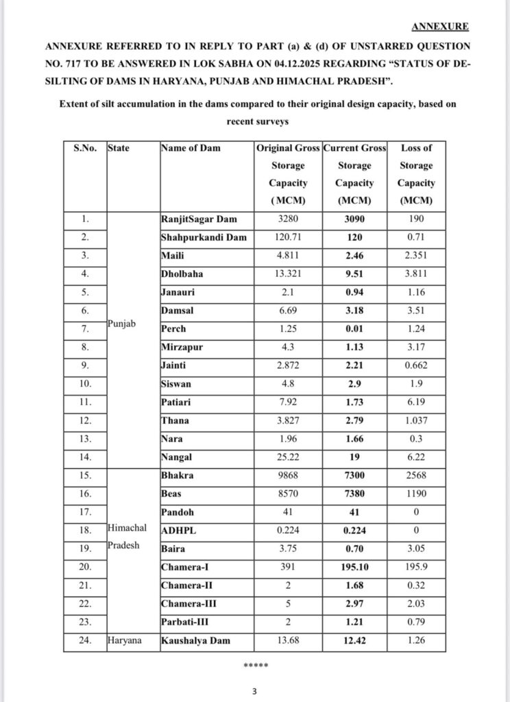 ਉਨ੍ਹਾਂ ਦੇ ਅਨ-ਸਟਾਰਡ ਪ੍ਰਸ਼ਨ ਨੰਬਰ 717 ਦੇ ਜਵਾਬ ਵਿੱਚ, ਜਲ ਸ਼ਕਤੀ ਮੰਤਰਾਲੇ ਨੇ ਦੱਸਿਆ ਕਿ ਨਵੀਨਤਮ ਰਾਸ਼ਟਰੀ ਰਜਿਸਟਰ ਆਫ਼ ਸਪੈਸੀਫਾਈਡ ਡੈਮਜ਼ (2025) ਦੇ ਅਨੁਸਾਰ, ਹਰਿਆਣਾ ਵਿੱਚ 3 ਨਿਰਧਾਰਤ ਡੈਮ ਹਨ, ਪੰਜਾਬ ਵਿੱਚ 15 ਹਨ, ਅਤੇ ਹਿਮਾਚਲ ਪ੍ਰਦੇਸ਼ ਵਿੱਚ 24 ਹਨ, ਜਿਨ੍ਹਾਂ ਦੇ ਮੌਜੂਦਾ ਸਟੋਰੇਜ ਸਮਰੱਥਾ ਲਈ ਕੁੱਲ 24 ਭੰਡਾਰਨ ਦਾ ਮੁਲਾਂਕਣ ਕੀਤਾ ਗਿਆ ਹੈ।