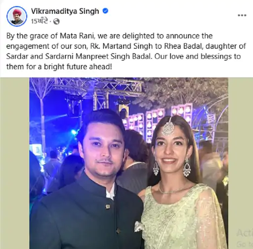 ਪੰਜਾਬ ਦੇ ਸਾਬਕਾ ਵਿੱਤ ਮੰਤਰੀ ਅਤੇ ਭਾਜਪਾ ਨੇਤਾ ਮਨਪ੍ਰੀਤ ਬਾਦਲ ਦੀ ਧੀ ਰੀਆ ਦਾ ਸਬੰਧ ਜੰਮੂ ਦੇ ਸ਼ਾਹੀ ਪਰਿਵਾਰ ਨਾਲ ਜੁੜ ਗਿਆ ਹੈ। ਰੀਆ ਦੀ ਮੰਗਣੀ ਸੀਨੀਅਰ ਕਾਂਗਰਸੀ ਨੇਤਾ ਕਰਨ ਸਿੰਘ ਦੇ ਪੋਤੇ ਆਰ.ਕੇ. ਮਾਰਤੰਡ ਨਾਲ ਹੋਈ ਹੈ। ਇਹ ਜਾਣਕਾਰੀ ਉਨ੍ਹਾਂ ਦੇ ਪੁੱਤਰ ਵਿਕਰਮਾਦਿੱਤਿਆ ਨੇ ਖੁਦ ਦਿੱਤੀ। ਉਨ੍ਹਾਂ ਨੇ ਜੋੜੇ ਨੂੰ ਆਪਣੀਆਂ ਸ਼ੁਭਕਾਮਨਾਵਾਂ ਪੋਸਟ ਕਰਦੇ ਹੋਏ ਲਿਖਿਆ, “ਮਾਤਾ ਰਾਣੀ ਦੇ ਆਸ਼ੀਰਵਾਦ ਨਾਲ, ਅਸੀਂ ਅੱਜ ਬਹੁਤ ਖੁਸ਼ ਹਾਂ। ਮੇਰੇ ਪੁੱਤਰ ਦੀ ਮੰਗਣੀ ਬਾਦਲ ਪਰਿਵਾਰ ਦੇ ਇੱਕ ਮੈਂਬਰ ਨਾਲ ਹੋਈ ਹੈ। ਆਰ.ਕੇ. ਮਾਰਤੰਡ ਜੰਮੂ-ਕਸ਼ਮੀਰ ਰਿਆਸਤ ਦੇ ਸਾਬਕਾ ਰਾਜਾ ਹਰੀ ਸਿੰਘ ਦੀ ਚੌਥੀ ਪੀੜ੍ਹੀ ਦੇ ਵੰਸ਼ਜ ਹਨ।”