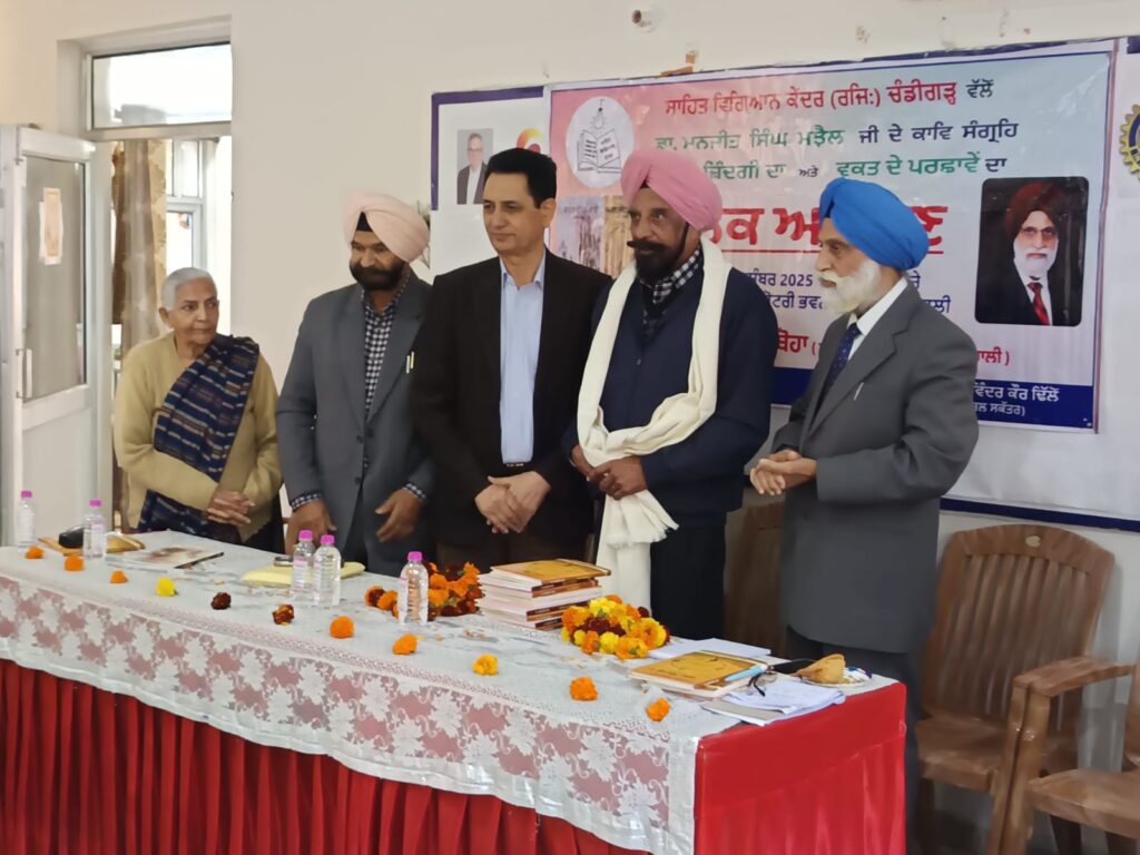 ਸਾਹਿਤ ਵਿਗਿਆਨ ਕੇਂਦਰ ਚੰਡੀਗੜ੍ਹ ਵਲੋਂ ਰੋਟਰੀ ਕਲੱਬ ਸੈਕਟਰ 70 ਮੁਹਾਲੀ ਵਿਖੇ ਡਾ. ਮਨਜੀਤ ਸਿੰਘ ਮਝੈਲ ਦੀਆਂ ਦੋ ਪੁਸਤਕਾਂ “ਕਾਸਾ ਜ਼ਿੰਦਗੀ ਦਾ ਅਤੇ ਵਕਤ ਦੇ ਪਰਛਾਂਵੇਂ” (ਕਾਵਿ ਸੰਗ੍ਰਹਿ) ਲੋਕ ਅਰਪਣ ਕੀਤੀਆਂ ਗਈਆਂ ।ਪ੍ਰਧਾਨਗੀ ਮੰਡਲ ਵਿੱਚ ਡਾ. ਦਵਿੰਦਰ ਬੋਹਾ(ਸਾਬਕਾ ਜ਼ਿਲ੍ਹਾ ਭਾਸ਼ਾ ਅਫਸਰ ਮੁਹਾਲੀ) ਡਾ.ਅਵਤਾਰ ਸਿੰਘ ਪਤੰਗ,ਸ਼੍ਰੀਮਤੀ ਪਰਮਜੀਤ ਕੌਰ ਪਰਮ ,ਲੇਖਕ ਡਾ. ਮਨਜੀਤ ਸਿੰਘ ਮਝੈਲ, ਗੁਰਦਰਸ਼ਨ ਸਿੰਘ ਮਾਵੀ ਅਤੇ ਦਵਿੰਦਰ ਕੌਰ ਢਿੱਲੋਂ ਸ਼ਾਮਿਲ ਸਨ। ਸਭ ਤੋਂ ਪਹਿਲਾਂ ਸਾਡੇ ਬਹੁਤ ਹੀ ਸੁਹਿਰਦ ਮੈਂਬਰ ਪ੍ਰੋਫ਼ੈਸਰ ਦਿਲਬਾਗ ਸਿੰਘ ਜੀ ਨੂੰ ਦੋ ਮਿੰਟ ਦਾ ਮੌਨ ਧਾਰ ਕੇ ਸ਼ਰਧਾਂਜਲੀ ਭੇਂਟ ਕੀਤੀ ਗਈ । ਕੇਂਦਰ ਦੇ ਪ੍ਰਧਾਨ ਗੁਰਦਰਸ਼ਨ ਸਿੰਘ ਮਾਵੀ ਨੇ ਆਏ ਹੋਏ ਸਾਰੇ ਸਾਹਿਤਕਾਰਾਂ ਨੂੰ ਜੀ ਆਇਆਂ ਕਿਹਾ ਤੇ ਅੱਜ ਦੇ ਵਿਸ਼ੇਸ਼ ਪ੍ਰੋਗਰਾਮ ਦੀ ਵਿਸਥਾਰ ਨਾਲ ਜਾਣਕਾਰੀ ਦਿੱਤੀ । ਇਸ ਤੋਂ ਬਾਅਦ ਪ੍ਰਧਾਨਗੀ ਮੰਡਲ ਦੁਆਰਾ ਡਾ. ਮਨਜੀਤ ਸਿੰਘ ਮਝੈਲ ਦੀਆਂ ਪੁਸਤਕਾਂ ਲੋਕ ਅਰਪਣ ਕੀਤੀਆਂ ਗਈਆਂ ।ਇਸ ਸਮੇਂ ਲੇਖਕ ਦੀ ਜੀਵਨ ਸਾਥਣ ਸ਼੍ਰੀਮਤੀ ਸੁਦਰਸ਼ਨ ਕੌਰ ਵੀ ਨਾਲ ਸੀ ।ਡਾ. ਅਵਤਾਰ ਸਿੰਘ ਪਤੰਗ ਨੇ ਆਪਣੇ ਵਿਚਾਰ ਪੇਸ਼ ਕਰਦੇ ਹੋਏ ਕਿਹਾ ਕਿ ਕਵਿਤਾ ਲਿਖਣਾ ਇੱਕ ਸਾਧਨਾ ਹੁੰਦੀ ਹੈ ।