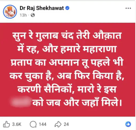 ਪੰਜਾਬ ਦੇ ਰਾਜਪਾਲ ਗੁਲਾਬਚੰਦ ਕਟਾਰੀਆ ਨੂੰ ਖੱਤਰੀ ਕਰਨੀ ਸੈਨਾ ਨੇ ਧਮਕੀ ਦਿੱਤੀ ਹੈ। ਰਾਸ਼ਟਰੀ ਪ੍ਰਧਾਨ ਰਾਜ ਸ਼ੇਖਾਵਤ ਨੇ ਸੋਸ਼ਲ ਮੀਡੀਆ ‘ਤੇ ਲਿਖਿਆ, “ਸੁਣੋ, ਗੁਲਾਬਚੰਦ, ਆਪਣੀਆਂ ਹੱਦਾਂ ਵਿੱਚ ਰਹੋ। ਤੁਸੀਂ ਪਹਿਲਾਂ ਹੀ ਸਾਡੇ ਮਹਾਰਾਣਾ ਪ੍ਰਤਾਪ ਦਾ ਅਪਮਾਨ ਕਰ ਚੁੱਕੇ ਹੋ। ਅੱਗੇ ਕੀ ਹੈ? ਕਰਨੀ ਸੈਨਾ ਦੇ ਸਿਪਾਹੀ, ਉਸਨੂੰ ਜਦੋਂ ਵੀ ਅਤੇ ਜਿੱਥੇ ਵੀ ਮਿਲੋ ਮਾਰ ਦਿਓ।” ਤਿੰਨ ਦਿਨ ਪਹਿਲਾਂ, ਗੁਲਾਬਚੰਦ ਕਟਾਰੀਆ ਨੇ ਉਦੈਪੁਰ ਦੇ ਗੋਗੁੰਡਾ ਵਿੱਚ ਮਹਾਰਾਣਾ ਪ੍ਰਤਾਪ ਬਾਰੇ ਇੱਕ ਬਿਆਨ ਦਿੱਤਾ ਸੀ, ਜਿਸ ਕਾਰਨ ਵਿਰੋਧ ਪ੍ਰਦਰਸ਼ਨ ਸ਼ੁਰੂ ਹੋ ਗਏ ਸਨ। ਕੁਝ ਲੋਕ ਕਟਾਰੀਆ ਦੇ ਬਿਆਨ ਤੋਂ ਨਾਰਾਜ਼ਗੀ ਪ੍ਰਗਟ ਕਰ ਰਹੇ ਹਨ ਅਤੇ ਪੋਸਟ ਦਾ ਸਮਰਥਨ ਕਰ ਰਹੇ ਹਨ। ਗੁਲਾਬਚੰਦ ਕਟਾਰੀਆ ਨੇ ਅਜੇ ਤੱਕ ਇਸ ਮਾਮਲੇ ਵਿੱਚ ਸ਼ਿਕਾਇਤ ਦਰਜ ਨਹੀਂ ਕਰਵਾਈ ਹੈ। ਉਦੈਪੁਰ ਦੇ ਪੁਲਿਸ ਸੁਪਰਡੈਂਟ ਯੋਗੇਸ਼ ਗੋਇਲ ਨੇ ਕਿਹਾ, “ਮਾਮਲਾ ਹੁਣੇ ਹੀ ਸਾਹਮਣੇ ਆਇਆ ਹੈ; ਪੁਲਿਸ ਜਾਂਚ ਕਰ ਰਹੀ ਹੈ।”