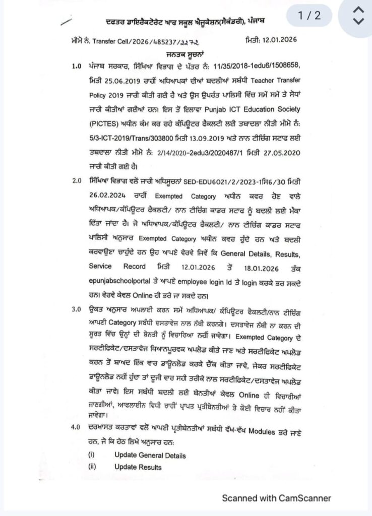 ਸਿੱਖਿਆ ਵਿਭਾਗ (ਸੈਕੰਡਰੀ) ਪੰਜਾਬ ਨੇ ‘Exempted Category’ ਅਧੀਨ ਆਉਂਦੇ ਅਧਿਆਪਕਾਂ, ਕੰਪਿਊਟਰ ਫੈਕਲਟੀ ਅਤੇ ਨਾਨ-ਟੀਚਿੰਗ ਸਟਾਫ਼ ਨੂੰ ਬਦਲੀ ਕਰਵਾਉਣ ਦਾ ਮੌਕਾ ਦਿੱਤਾ ਹੈ।ਜਾਰੀ ਪੱਤਰ ਅਨੁਸਾਰ, ਇੱਛੁਕ ਕਰਮਚਾਰੀ 18 ਜਨਵਰੀ 2026 ਤੱਕ ਆਪਣੇ ਵੇਰਵੇ ‘epunjabschool’ ਪੋਰਟਲ ‘ਤੇ ਆਨਲਾਈਨ ਭਰ ਸਕਦੇ ਹਨ।
