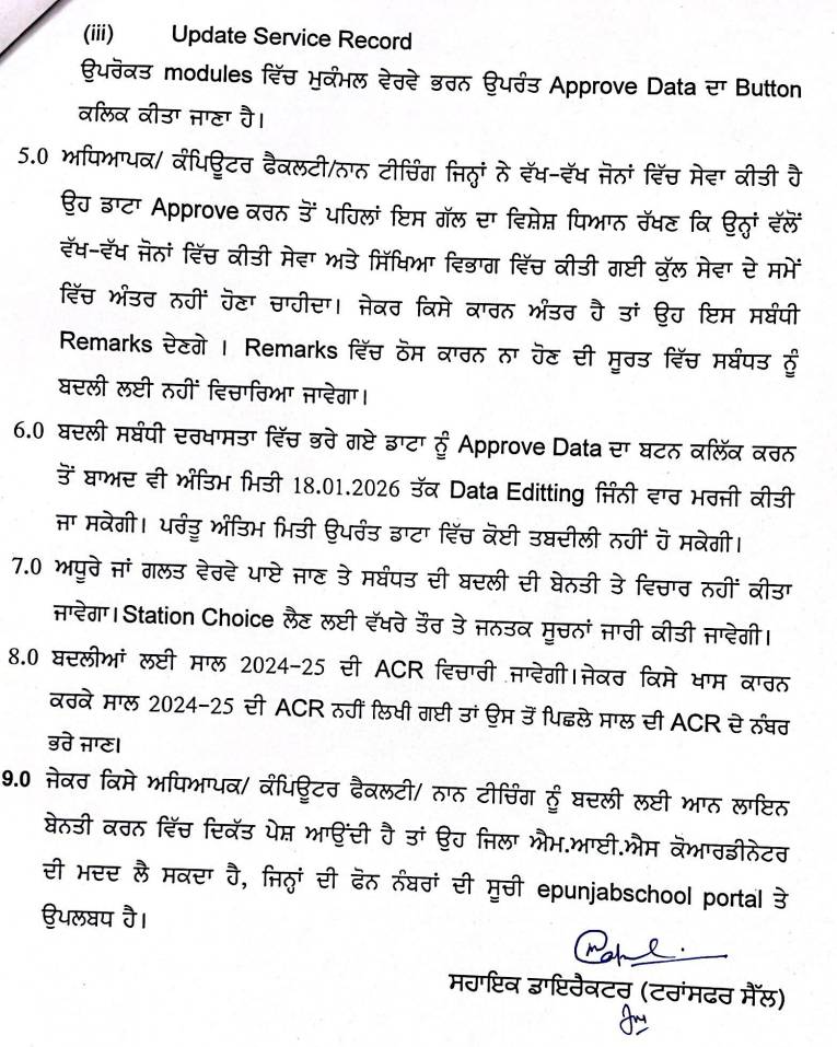 ਡੇਟਾ ਅਪਰੂਵ ਕਰਨ ਤੋਂ ਬਾਅਦ 18 ਜਨਵਰੀ ਤੱਕ ਐਡਿਟ ਕੀਤਾ ਜਾ ਸਕਦਾ ਹੈ, ਪਰ ਉਸ ਤੋਂ ਬਾਅਦ ਕੋਈ ਤਬਦੀਲੀ ਨਹੀਂ ਹੋਵੇਗੀ। ਜਦੋਂਕਿ ਸਟੇਸ਼ਨ ਚੋਣ ਲਈ ਵੱਖਰੇ ਤੌਰ ‘ਤੇ ਨੋਟਿਸ ਜਾਰੀ ਕੀਤਾ ਜਾਵੇਗਾ।ਸਿੱਖਿਆ ਵਿਭਾਗ ਪੰਜਾਬ ਨੇ ਸਪੱਸ਼ਟ ਕੀਤਾ ਹੈ ਕਿ ਸਾਰੀ ਪ੍ਰਕਿਰਿਆ ਪਾਰਦਰਸ਼ੀ ਅਤੇ ਆਨਲਾਈਨ ਹੋਵੇਗੀ, ਆਫਲਾਈਨ ਬੇਨਤੀਆਂ ਨੂੰ ਸਵੀਕਾਰ ਨਹੀਂ ਕੀਤਾ ਜਾਵੇਗਾ।