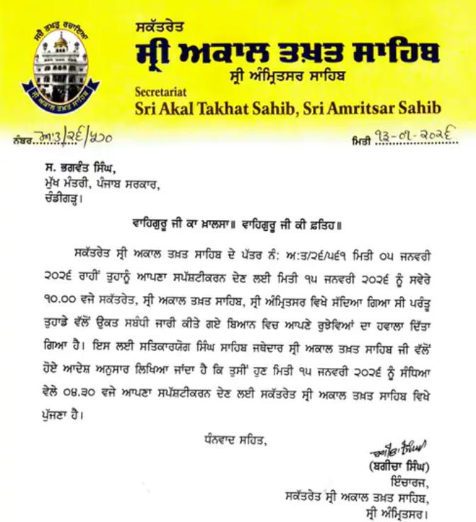 ਪੰਜਾਬ ਦੇ ਮੁੱਖ ਮੰਤਰੀ ਭਗਵੰਤ ਮਾਨ ਦੇ 15 ਜਨਵਰੀ ਨੂੰ ਸ੍ਰੀ ਅਕਾਲ ਤਖ਼ਤ ਸਾਹਿਬ ‘ਤੇ ਪੇਸ਼ ਹੋਣ ਦਾ ਸਮਾਂ ਬਦਲ ਦਿੱਤਾ ਗਿਆ ਹੈ। ਅਕਾਲ ਤਖ਼ਤ ਸਕੱਤਰੇਤ ਨੇ ਇਸ ਸਬੰਧੀ ਇੱਕ ਬਿਆਨ ਜਾਰੀ ਕੀਤਾ ਹੈ। ਕਿਹਾ ਗਿਆ ਹੈ ਕਿ ਉਹ ਹੁਣ 15 ਜਨਵਰੀ ਨੂੰ ਸਵੇਰੇ 10 ਵਜੇ ਦੀ ਬਜਾਏ ਸ਼ਾਮ 4:30 ਵਜੇ ਪਹੁੰਚਣਗੇ। ਤੁਹਾਨੂੰ ਦੱਸ ਦੇਈਏ ਕਿ ਅਕਾਲ ਤਖ਼ਤ ਨੇ ਮਾਨ ਦੇ ਬਿਆਨਾਂ ਅਤੇ ਵਾਇਰਲ ਵੀਡੀਓ ‘ਤੇ ਸਪੱਸ਼ਟੀਕਰਨ ਮੰਗਿਆ ਹੈ। ਇਸ ਤੋਂ ਪਹਿਲਾਂ ਮੁੱਖ ਮੰਤਰੀ ਨੇ ਕਿਹਾ ਸੀ ਕਿ ਰਾਸ਼ਟਰਪਤੀ ਦ੍ਰੋਪਦੀ ਮੁਰਮੂ ਦਾ 15 ਜਨਵਰੀ ਨੂੰ ਅੰਮ੍ਰਿਤਸਰ ਵਿੱਚ ਪ੍ਰੋਗਰਾਮ ਹੈ, ਪਰ ਉਹ ਨਿਰਧਾਰਤ ਸਮੇਂ ‘ਤੇ ਸ੍ਰੀ ਅਕਾਲ ਤਖ਼ਤ ਸਾਹਿਬ ‘ਤੇ ਪੇਸ਼ ਨਹੀਂ ਹੋ ਸਕਣਗੇ, ਪਰ ਉਹ ਅਕਾਲ ਤਖ਼ਤ ਸਾਹਿਬ ‘ਤੇ ਜ਼ਰੂਰ ਪੇਸ਼ ਹੋਣਗੇ। ਇਸ ਬਿਆਨ ਦਾ ਨੋਟਿਸ ਲੈਂਦਿਆਂ ਅਕਾਲ ਤਖ਼ਤ ਨੇ ਇਹ ਫੈਸਲਾ ਲਿਆ ਹੈ। ਇਹ ਗੱਲ ਧਿਆਨ ਦੇਣ ਯੋਗ ਹੈ ਕਿ ਮੁੱਖ ਮੰਤਰੀ ਭਗਵੰਤ ਮਾਨ ਨੇ ਕਿਹਾ ਸੀ ਕਿ ਉਹ ਨੰਗੇ ਪੈਰੀਂ ਅਕਾਲ ਤਖ਼ਤ ਜਾਣਗੇ। ਉਨ੍ਹਾਂ ਨੇ ਜਥੇਦਾਰ ਨੂੰ ਗੋਲਕ ਦੇ ਵੇਰਵੇ ਸਬੂਤਾਂ ਸਮੇਤ ਪੇਸ਼ ਕਰਦੇ ਸਮੇਂ ਪੂਰੇ ਸਮਾਗਮ ਦਾ ਸਿੱਧਾ ਪ੍ਰਸਾਰਣ ਕਰਨ ਦੀ ਬੇਨਤੀ ਵੀ ਕੀਤੀ ਸੀ।