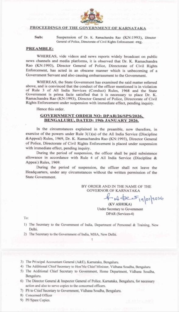 ਸੀਨੀਅਰ ਆਈਪੀਐਸ ਅਧਿਕਾਰੀ ਰਾਮਚੰਦਰ ਰਾਓ ਨੂੰ ਕਰਨਾਟਕ ਸਰਕਾਰ ਨੇ ਮੁਅੱਤਲ ਕਰ ਦਿੱਤਾ, ਜਿਨ੍ਹਾਂ ਕੋਲ ਪੁਲਿਸ ਡਾਇਰੈਕਟਰ ਜਨਰਲ (ਡੀਜੀਪੀ) ਦਾ ਰੈਂਕ ਹੈ। ਇਹ ਕਾਰਵਾਈ ਸੋਸ਼ਲ ਮੀਡੀਆ ‘ਤੇ ਵਾਇਰਲ ਹੋਈ ਇੱਕ ਵੀਡੀਓ ਤੋਂ ਬਾਅਦ ਕੀਤੀ ਗਈ, ਜਿਸ ਵਿੱਚ ਕਥਿਤ ਤੌਰ ‘ਤੇ ਰਾਓ ਨੂੰ ਆਪਣੇ ਸਰਕਾਰੀ ਦਫ਼ਤਰ ਵਿੱਚ ਵੱਖ-ਵੱਖ ਔਰਤਾਂ ਨਾਲ ਅਣਉਚਿਤ ਅਤੇ ਨਿੱਜੀ ਵਿਵਹਾਰ ਕਰਦੇ ਦਿਖਾਇਆ ਗਿਆ ਹੈ।