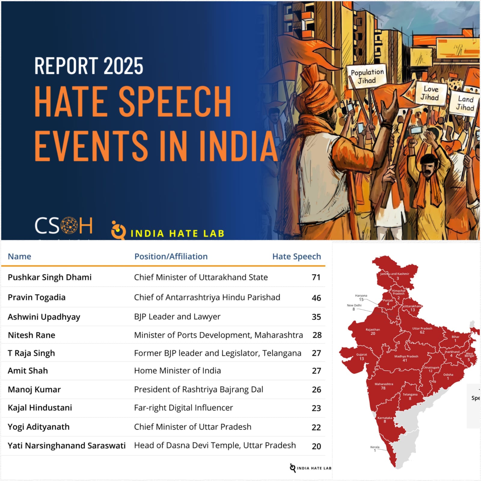 ਅਮਰੀਕਾ ਦੇ ਵਾਸ਼ਿੰਗਟਨ ਸਥਿਤ ਇੱਕ ਗੈਰ-ਸਰਕਾਰੀ ਸੰਸਥਾ ਸੈਂਟਰ ਫਾਰ ਸਟੱਡੀ ਆਫ਼ ਆਰਗੇਨਾਈਜ਼ਡ ਹੇਟ ਨੇ ਭਾਰਤ ਵਿੱਚ ਨਫ਼ਰਤੀ ਭਾਸ਼ਣ ‘ਤੇ ਇੱਕ ਰਿਪੋਰਟ ਜਾਰੀ ਕੀਤੀ ਹੈ। ਜਾਰੀ ਕੀਤੀ ਗਈ ‘ਰਿਪੋਰਟ 2025, ਹੇਟ ਸਪੀਚ ਇਵੈਂਟਸ ਇਨ ਇੰਡੀਆ’ ਨਾਮ ਦੀ ਇਸ ਵਿਸਥਾਰ ਪੂਰਵਕ ਰਿਪੋਰਟ ਵਿੱਚ ਹੈਰਾਨ ਕਰਨ ਵਾਲੇ ਦਾਅਵੇ ਕੀਤੇ ਗਏ ਹਨ। ਰਿਪੋਰਟ ਦੇ ਅਨੁਸਾਰ, ਸਾਲ 2025 ਵਿੱਚ ਭਾਰਤ ਵਿੱਚ ਕੁੱਲ 1318 ਸਿੱਧੇ ਨਫ਼ਰਤੀ ਭਾਸ਼ਣ ਦਰਜ ਕੀਤੇ ਗਏ। ਉੱਥੇ ਹੀ 2024 ਦੀ ਤੁਲਨਾ ਵਿੱਚ ਇਹ 13 ਫ਼ੀਸਦੀ ਅਤੇ 2023 ਦੀ ਤੁਲਨਾ ਵਿੱਚ 97 ਫ਼ੀਸਦੀ ਦਾ ਵਾਧਾ ਹੈ। ਇਹ ਰਿਪੋਰਟ 2025 ਵਿੱਚ ਦੇਸ਼ ਭਰ ਵਿੱਚ ਵਿਅਕਤੀਗਤ ਨਫ਼ਰਤ ਭਰੇ ਭਾਸ਼ਣ ਦੀਆਂ ਘਟਨਾਵਾਂ ਦੇ ਪ੍ਰਮਾਣਿਤ ਉਦਾਹਰਣਾਂ ਦਾ ਦਸਤਾਵੇਜ਼ੀਕਰਨ ਅਤੇ ਵਿਸ਼ਲੇਸ਼ਣ ਕਰਦੀ ਹੈ, ਜਿਸ ਵਿੱਚ ਰਾਜਨੀਤਿਕ ਰੈਲੀਆਂ, ਧਾਰਮਿਕ ਜਲੂਸ, ਵਿਰੋਧ ਮਾਰਚ ਅਤੇ ਰਾਸ਼ਟਰਵਾਦੀ ਇਕੱਠ ਸ਼ਾਮਲ ਹਨ। 2024 ਵਿੱਚ ਦੇਖੇ ਗਏ ਨਫ਼ਰਤ ਭਰੇ ਭਾਸ਼ਣ ਵਿੱਚ ਬੇਮਿਸਾਲ ਵਾਧੇ ਤੋਂ ਬਾਅਦ, 2025 ਵਿੱਚ ਨਫ਼ਰਤ ਭਰੇ ਭਾਸ਼ਣ ਦੀਆਂ ਘਟਨਾਵਾਂ ਦੀ ਕੁੱਲ ਮਾਤਰਾ ਹੋਰ ਵੱਧ ਗਈ, ਜੋ ਕਿ ਭਾਰਤ ਦੇ ਰਾਜਨੀਤਿਕ ਅਤੇ ਸਮਾਜਿਕ ਦ੍ਰਿਸ਼ਟੀਕੋਣ ਦੀ ਇੱਕ ਨਿਯਮਤ ਵਿਸ਼ੇਸ਼ਤਾ ਵਜੋਂ ਸੰਪਰਦਾਇਕ ਬਿਆਨਬਾਜ਼ੀ ਦੇ ਡੂੰਘੇ ਜੜ੍ਹ ਨੂੰ ਦਰਸਾਉਂਦੀ ਹੈ। ਉੱਤਰਾਖੰਡ ਦੇ ਮੁੱਖ ਮੰਤਰੀ ਪੁਸ਼ਕਰ ਸਿੰਘ ਧਾਮੀ 2025 ਵਿੱਚ ਸਭ ਤੋਂ ਵੱਧ ਨਫ਼ਰਤ ਫੈਲਾਉਣ ਵਾਲੇ ਅਦਾਕਾਰ ਵਜੋਂ ਉਭਰੇ, ਜਿਨ੍ਹਾਂ ਨੇ 71 ਭਾਸ਼ਣ ਦਿੱਤੇ, ਉਨ੍ਹਾਂ ਤੋਂ ਬਾਅਦ ਅੰਤਰਰਾਸ਼ਟਰੀ ਹਿੰਦੂ ਪਰਿਸ਼ਦ ਦੇ ਮੁਖੀ ਪ੍ਰਵੀਨ ਤੋਗੜੀਆ (46) ਅਤੇ ਭਾਜਪਾ ਨੇਤਾ ਅਸ਼ਵਨੀ ਉਪਾਧਿਆਏ (35) ਦਾ ਨੰਬਰ ਆਉਂਦਾ ਹੈ। 2025 ਵਿੱਚ ਧਾਰਮਿਕ ਘੱਟ ਗਿਣਤੀਆਂ ਨੂੰ ਨਿਸ਼ਾਨਾ ਬਣਾਉਣ ਵਾਲੀਆਂ ਦਰਜ ਕੀਤੀਆਂ ਨਫ਼ਰਤ ਭਰੇ ਭਾਸ਼ਣ ਦੀਆਂ ਘਟਨਾਵਾਂ ਦੀ ਗਿਣਤੀ 2024 ਵਿੱਚ ਦਰਜ 1,165 ਮਾਮਲਿਆਂ ਨੂੰ ਪਾਰ ਕਰ ਗਈ। ਇਹ ਵਾਧਾ ਭਾਰਤ ਦੇ ਰਾਜਨੀਤਿਕ ਦ੍ਰਿਸ਼ਟੀਕੋਣ ਵਿੱਚ ਇੱਕ ਮਹੱਤਵਪੂਰਨ ਤਬਦੀਲੀ ਦਾ ਸੰਕੇਤ ਦਿੰਦਾ ਹੈ, ਜਿਸ ਵਿੱਚ ਭੜਕਾਊ ਬਿਆਨਬਾਜ਼ੀ ਇੱਕ ਮੁਹਿੰਮ-ਵਿਸ਼ੇਸ਼ ਰਣਨੀਤੀ ਤੋਂ ਰਾਜਨੀਤਿਕ ਸ਼ਾਸਨ ਦੇ ਇੱਕ ਆਮ ਅਤੇ ਨਿਰੰਤਰ ਤੈਨਾਤ ਵਿਧੀ ਵਿੱਚ ਵਿਕਸਤ ਹੋਈ ਹੈ। 2025 ਵਿੱਚ ਨਫ਼ਰਤ ਭਰੇ ਭਾਸ਼ਣ ਦੀ ਨਿਰੰਤਰ ਤੀਬਰਤਾ ਸੱਤਾਧਾਰੀ ਭਾਰਤੀ ਜਨਤਾ ਪਾਰਟੀ (ਭਾਜਪਾ) ਅਤੇ ਇਸ ਦੇ ਸਹਿਯੋਗੀ ਹਿੰਦੂ ਰਾਸ਼ਟਰਵਾਦੀ ਸੰਗਠਨਾਂ ਦੇ ਬਹੁਮਤਵਾਦੀ ਵਿਚਾਰਧਾਰਕ ਪ੍ਰੋਜੈਕਟ ਵਿੱਚ ਟਿਕੀ ਹੋਈ ਸੀ। ਸਾਡੀ 2024 ਦੀ ਰਿਪੋਰਟ ਨੇ ਇਸ ਗੱਲ ਨੂੰ ਉਜਾਗਰ ਕੀਤਾ ਕਿ ਉੱਚ-ਪੱਧਰੀ ਰਾਸ਼ਟਰੀ ਭਾਜਪਾ ਨੇਤਾ ਨਫ਼ਰਤ ਭਰੇ ਭਾਸ਼ਣ ਦੇ ਪ੍ਰਸਾਰ ਵਿੱਚ ਤੇਜ਼ੀ ਨਾਲ ਅੱਗੇ ਵਧੇ ਸਨ। ਸਾਲ 2025 ਵਿੱਚ ਇਸ ਰੁਝਾਨ ਨੂੰ ਇਕਜੁੱਟ ਅਤੇ ਮਜ਼ਬੂਤ ​​ਕੀਤਾ ਗਿਆ, ਜਿਸ ਨਾਲ ਫਿਰਕੂ ਦੁਸ਼ਮਣੀ ਪੈਦਾ ਕਰਨ ਲਈ ਇੱਕ ਉੱਪਰ ਤੋਂ ਹੇਠਾਂ ਪ੍ਰਵਾਨਗੀ ਸਥਾਪਤ ਕੀਤੀ ਗਈ ਜੋ ਜ਼ਮੀਨੀ ਪੱਧਰ ‘ਤੇ ਸੰਗਠਨ ਅਤੇ ਰਾਜਨੀਤੀ ਦੇ ਪੱਧਰ ਤੱਕ ਵਹਿ ਗਈ। ਉੱਚ-ਦਾਅ ਵਾਲੇ ਦਿੱਲੀ ਅਤੇ ਬਿਹਾਰ ਰਾਜ ਚੋਣਾਂ ਅਤੇ ਸਥਾਨਕ ਸੰਸਥਾਵਾਂ ਦੀਆਂ ਚੋਣਾਂ ਇਸ ਤਬਦੀਲੀ ਲਈ ਮੁੱਖ ਉਤਪ੍ਰੇਰਕ ਸਨ, ਜੋ ਕਿ ਬੇਦਖਲੀ ਅਤੇ ਡਰ ਪੈਦਾ ਕਰਨ ਵਾਲੇ ਬਿਰਤਾਂਤਾਂ ਦੀ ਵਾਰ-ਵਾਰ ਤਾਇਨਾਤੀ ਲਈ ਨਵੇਂ ਥੀਏਟਰ ਵਜੋਂ ਕੰਮ ਕਰਦੀਆਂ ਸਨ। ਇਸਦੇ ਨਾਲ ਹੀ, ਪ੍ਰਸਤਾਵਿਤ ਕਰਨਾਟਕ ਨਫ਼ਰਤ ਭਰੇ ਭਾਸ਼ਣ ਅਤੇ ਨਫ਼ਰਤ ਅਪਰਾਧ (ਰੋਕਥਾਮ) ਬਿੱਲ, 2025 ਵਰਗੇ ਨਵੇਂ ਸਥਾਨਕ ਵਿਧਾਨਕ ਉਪਾਵਾਂ ਦੇ ਲਾਗੂ ਹੋਣ ਨੇ ਮੁੱਦੇ ਦੀ ਗੰਭੀਰਤਾ ਦੀ ਵਧਦੀ, ਭਾਵੇਂ ਖੰਡਿਤ, ਰਾਜ-ਪੱਧਰੀ ਮਾਨਤਾ ਨੂੰ ਉਜ