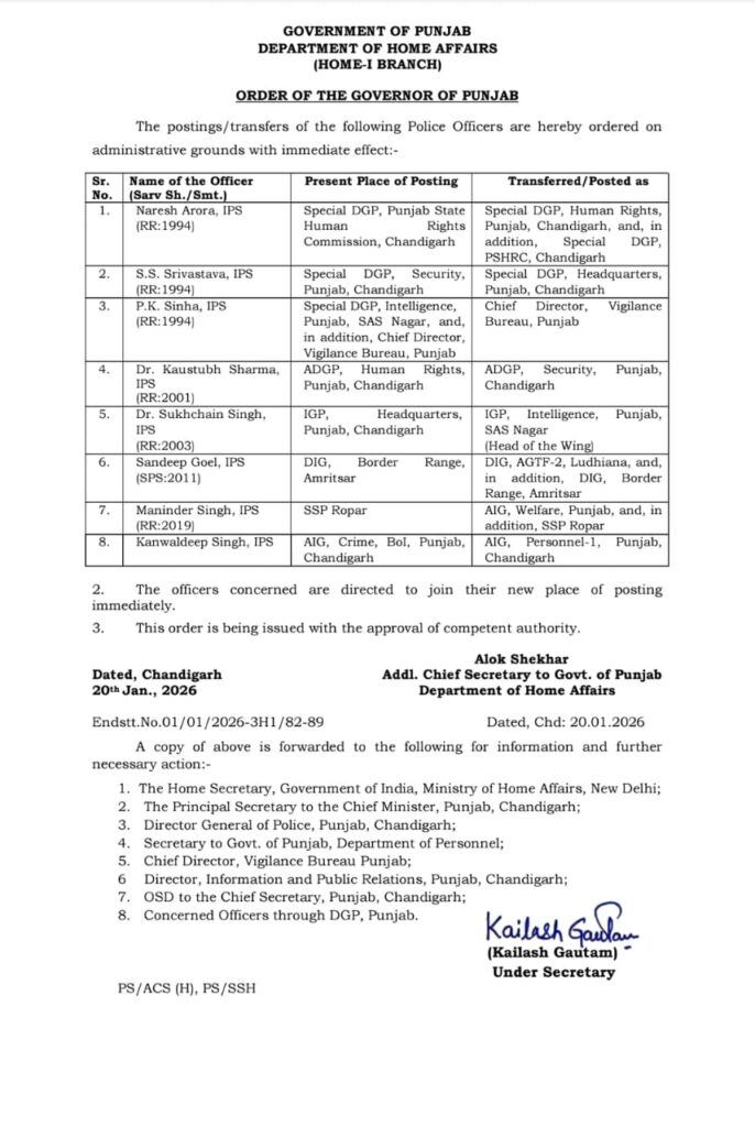 ਪੰਜਾਬ ਸਰਕਾਰ ਵੱਲੋਂ IPS ਅਫਸਰਾਂ ਦੇ ਤਬਾਦਲੇ ਕੀਤੇ ਗਏ ਹਨ ਮੰਗਲਵਾਰ ਨੂੰ ਪੰਜਾਬ ਪੁਲਿਸ ਵਿੱਚ ਫੇਰਬਦਲ ਕੀਤਾ ਗਿਆ। ਆਈਪੀਐਸ ਅਧਿਕਾਰੀ ਸੁਖਚੈਨ ਸਿੰਘ ਗਿੱਲ ਨੂੰ ਪੰਜਾਬ ਇੰਟੈਲੀਜੈਂਸ ਦਾ ਆਈਜੀ ਨਿਯੁਕਤ ਕੀਤਾ ਗਿਆ। ਮਨਿੰਦਰ ਸਿੰਘ ਨੂੰ ਏਆਈਜੀ ਵੈਲਫੇਅਰ, ਪੰਜਾਬ ਦੇ ਨਾਲ-ਨਾਲ ਐਸਐਸਪੀ ਰੋਪੜ ਦੀ ਜ਼ਿੰਮੇਵਾਰੀ ਸੌਂਪੀ ਗਈ ਹੈ। ਇਸੇ ਤਰ੍ਹਾਂ ਕੰਵਲਦੀਪ ਸਿੰਘ ਨੂੰ ਏਆਈਜੀ ਪਰਸੋਨਲ ਦੀ ਜ਼ਿੰਮੇਵਾਰੀ ਸੌਂਪੀ ਗਈ ਹੈ। ਇਸ ਦੇ ਨਾਲ ਹੀ ਪੀਕੇ ਸਿਨਹਾ ਨੂੰ ਮੁੱਖ ਡਾਇਰੈਕਟਰ ਵਿਜੀਲੈਂਸ ਬਿਊਰੋ ਨਿਯੁਕਤ ਕੀਤਾ ਗਿਆ ਹੈ।