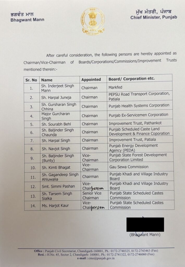 ਪੰਜਾਬ ਦੇ ਮੁੱਖ ਮੰਤਰੀ ਭਗਵੰਤ ਮਾਨ ਵੱਲੋਂ ਵੱਖ ਵੱਖ ਵਿਭਾਗਾਂ ਦੇ ਚੇਅਰਮੈਨ ਅਤੇ ਵਾਈਸ ਚੇਅਰਮੈਨ ਨਿਯੁਕਤ ਕੀਤੇ ਗਏ ਹਨ। ਮੁੱਖ ਮੰਤਰੀ ਵੱਲੋਂ 14 ਚੇਅਰਮੈਨ ਤੇ ਵਾਈਸ ਚੇਅਰਮੈਨ ਲਗਾਏ ਗਏ। ਮੁੱਖ ਮੰਤਰੀ ਨੇ ਸਾਰਿਆਂ ਨੂੰ ਨਵੀਂ ਜ਼ਿੰਮੇਵਾਰੀ ਲਈ ਬਹੁਤ-ਬਹੁਤ ਵਧਾਈਆਂ ਤੇ ਸ਼ੁੱਭਕਾਮਨਾਵਾਂ ਦਿੱਤੀਆਂ ਅਤੇ ਕਿਹਾ, ਉਮੀਦ ਕਰਦੇ ਹਾਂ ਕਿ ਸਾਰੇ ਆਪਣੀ ਜ਼ਿੰਮੇਵਾਰੀ ਨੂੰ ਪੂਰੀ ਤਨਦੇਹੀ ਨਾਲ ਨਿਭਾਉਣਗੇ ਅਤੇ ਪੰਜਾਬ ਨੂੰ ਰੰਗਲਾ ਪੰਜਾਬ ਬਣਾਉਣ ‘ਚ ਆਪਣਾ ਅਹਿਮ ਯੋਗਦਾਨ ਪਾਉਣਗੇ।