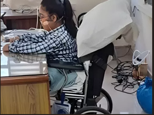 ਉਸਦੀ ਨੱਕ ਵਿੱਚ ਇੱਕ ਟਿਊਬ, ਵ੍ਹੀਲਚੇਅਰ ‘ਤੇ ਬੈਠੀ ਹੋਈ;