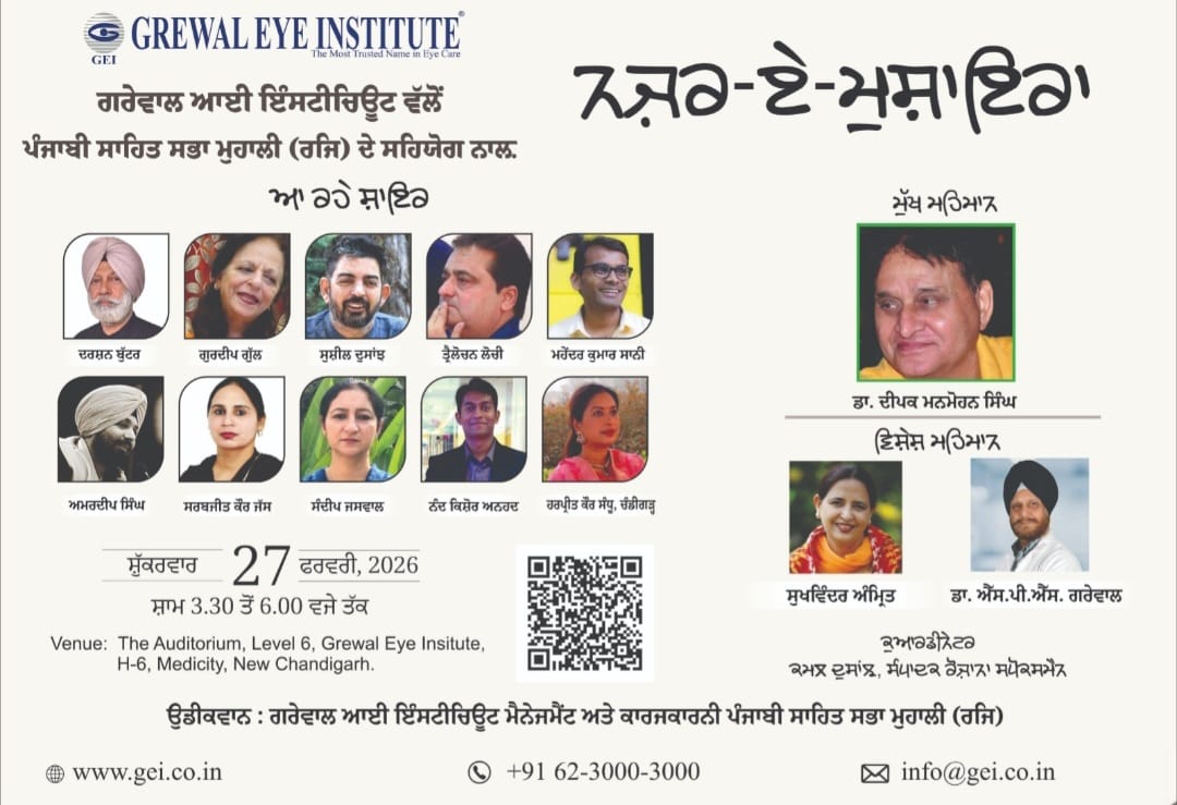 ਗਰੇਵਾਲ ਆਈ ਇੰਸਟੀਚਿਊਟ, ਚੰਡੀਗੜ੍ਹ ਵੱਲੋਂ ਪੰਜਾਬੀ ਸਾਹਿਤ ਸਭਾ ਮੁਹਾਲੀ ਦੇ ਸਹਿਯੋਗ ਨਾਲ਼ 27 ਫਰਵਰੀ ਨੂੰ ਤ੍ਰੈ-ਭਾਸ਼ੀ ਕਵੀਆਂ ’ਤੇ ਅਧਾਰਤ ‘ਨਜ਼ਰ-ਏ-ਮੁਸ਼ਾਇਰਾ’ ਕਰਵਾਇਆ ਜਾ ਰਿਹਾ ਹੈ। ਇਹ ਅਦਬੀ ਸਮਾਗਮ ਸ਼ੁੱਕਰਵਾਰ ਸ਼ਾਮ 3.30 ਤੋਂ 6.00 ਵਜੇ ਤੱਕ ਆਡੀਟੋਰੀਅਮ, ਗਰੇਵਾਲ ਆਈ ਇੰਸਟੀਚਿਊਟ, ਐੱਚ-6, ਮੈਡੀਸਿਟੀ, ਨਿਊ ਚੰਡੀਗੜ੍ਹ ਵਿਖੇ ਹੋਵੇਗਾ।