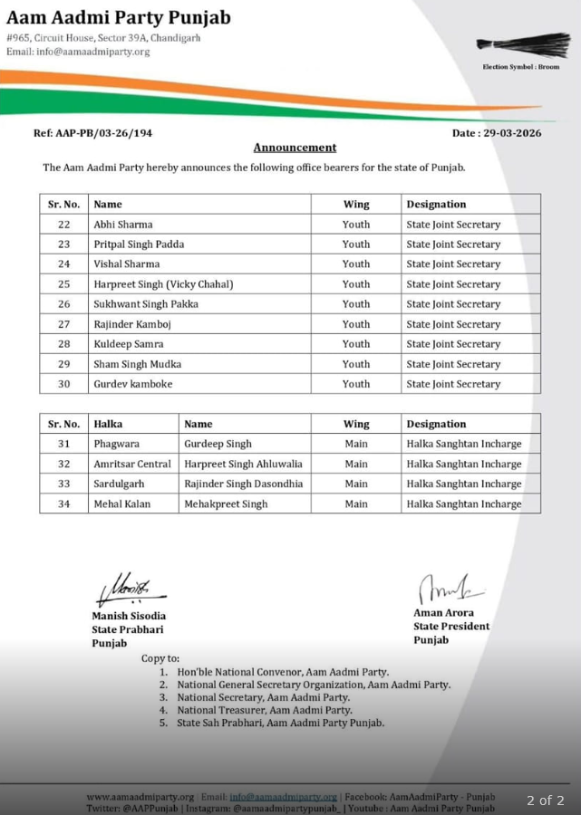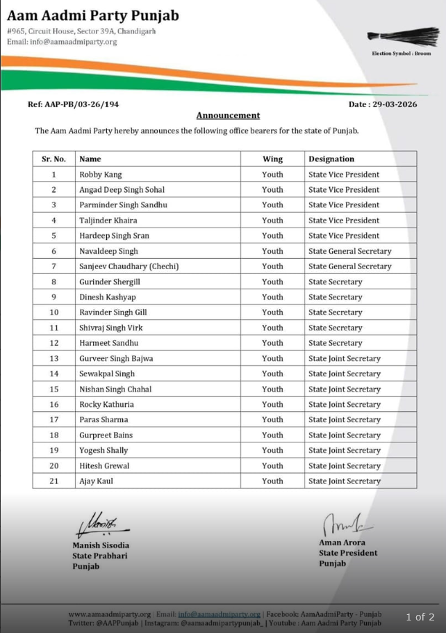 AAP ਵੱਲੋਂ ਯੂਥ ਵਿੰਗ ਦੇ ਅਹੁਦੇਦਾਰਾਂ ਦਾ ਐਲਾਨ ਕੀਤਾ ਗਿਆ ਹੈ