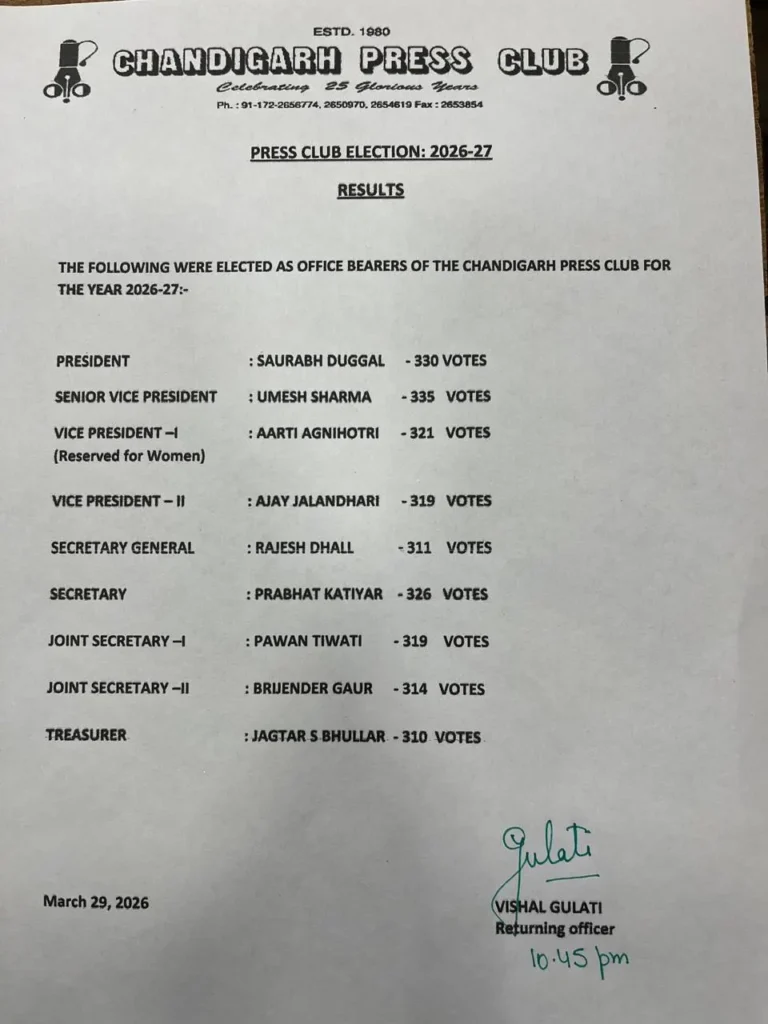 ਵਿਰੋਧੀ ਜੋਗਿੰਦਰ ਸਿੰਘ ਪੈਨਲ ਵਿੱਚੋਂ ਜਗਤਾਰ ਸਿੰਘ ਭੁੱਲਰ ਨੂੰ ਖਜ਼ਾਨਚੀ ਚੁਣਿਆ ਗਿਆ। ਇਸ ਤੋਂ ਇਲਾਵਾ, ਆਰਤੀ ਅਗਨੀਹੋਤਰੀ ਅਤੇ ਅਜੈ ਜਲੰਧਰੀ ਨੂੰ ਉਪ-ਪ੍ਰਧਾਨ ਚੁਣਿਆ ਗਿਆ, ਜਦੋਂ ਕਿ ਬਰਜਿੰਦਰ ਗੌੜ ਨੂੰ ਸੰਯੁਕਤ ਸਕੱਤਰ ਚੁਣਿਆ ਗਿਆ।ਇਸ ਸਾਲ ਚੰਡੀਗੜ੍ਹ ਪ੍ਰੈਸ ਕਲੱਬ ਚੋਣਾਂ ਵਿੱਚ, ਕੁੱਲ 735 ਮੈਂਬਰਾਂ ਦਾ ਵੋਟਰ ਸੀ, ਜਿਨ੍ਹਾਂ ਵਿੱਚੋਂ 626 ਵੋਟਾਂ ਪਈਆਂ। ਦੁੱਗਲ ਪੈਨਲ ਦੇ ਉਮੇਸ਼ ਸ਼ਰਮਾ ਨੂੰ ਸੀਨੀਅਰ ਉਪ ਪ੍ਰਧਾਨ ਚੁਣਿਆ ਗਿਆ। ਸ਼ਰਮਾ ਨੂੰ 335 ਵੋਟਾਂ ਮਿਲੀਆਂ, ਜਦੋਂ ਕਿ ਉਨ੍ਹਾਂ ਦੇ ਵਿਰੋਧੀ, ਮੁਕੇਸ਼ ਅਟਵਾਲ, ਨੂੰ 285 ਵੋਟਾਂ ਮਿਲੀਆਂ। ਉਪ ਪ੍ਰਧਾਨ-2 ਦੇ ਅਹੁਦੇ ਲਈ, ਅਜੇ ਜਲੰਧਰੀ 319 ਵੋਟਾਂ ਨਾਲ ਜੇਤੂ ਰਹੇ।