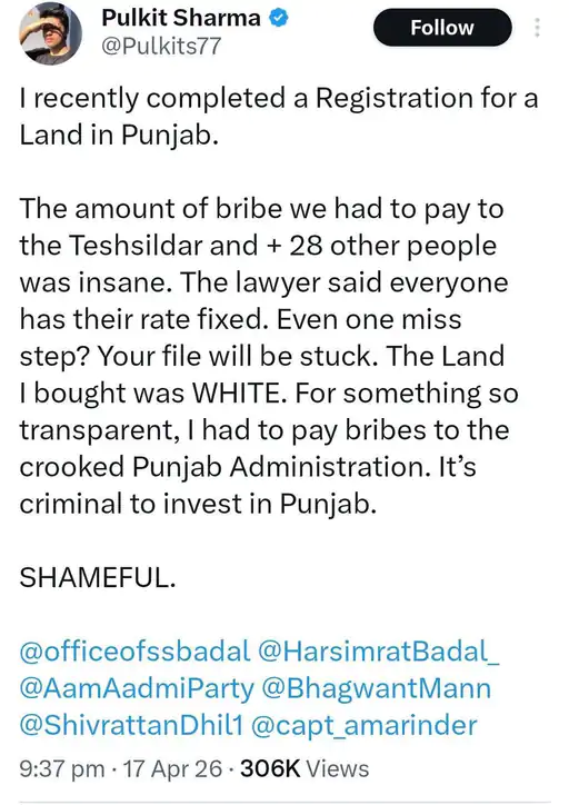 ਪੰਜਾਬ ਵਿੱਚ ਜ਼ਮੀਨ ਦੀਆਂ ਰਜਿਸਟ੍ਰੇਸ਼ਨਾਂ ਹੁਣ ਔਨਲਾਈਨ ਕੀਤੀਆਂ ਜਾਂਦੀਆਂ ਹਨ। ਸਰਕਾਰ ਦਾ ਦਾਅਵਾ ਹੈ ਕਿ ਰਜਿਸਟਰੀ ਔਨਲਾਈਨ ਅਪਲੋਡ ਕੀਤੀ ਜਾਂਦੀ ਹੈ, ਅਤੇ ਤਸਦੀਕ ਤੋਂ ਬਾਅਦ, ਖਰੀਦਦਾਰ ਸਬ-ਰਜਿਸਟਰਾਰ ਦੇ ਦਫ਼ਤਰ ਜਾ ਕੇ ਫੋਟੋ ਖਿੱਚ ਸਕਦਾ ਹੈ। ਸਰਕਾਰ ਦੇ ਇਸ ਦਾਅਵੇ ਦਾ ਪਰਦਾਫਾਸ਼ ਪੁਲਕਿਤ ਨਾਮ ਦੇ ਇੱਕ ਸਾਬਕਾ ਕ੍ਰਿਕਟਰ ਨੇ ਕੀਤਾ ਹੈ। ਪੁਲਕਿਤ ਨੇ ਆਪਣੇ ਸੋਸ਼ਲ ਮੀਡੀਆ ਅਕਾਊਂਟ (X) ‘ਤੇ ਲਿਖਿਆ ਕਿ ਉਸਨੇ ਪੰਜਾਬ ਵਿੱਚ ਜ਼ਮੀਨ ਦਾ ਇੱਕ ਟੁਕੜਾ ਖਰੀਦਿਆ ਅਤੇ ਇਸਨੂੰ ਰਜਿਸਟਰ ਕਰਵਾਇਆ। ਰਜਿਸਟ੍ਰੇਸ਼ਨ ਕਰਵਾਉਣ ਲਈ ਉਸਨੂੰ ਤਹਿਸੀਲਦਾਰ ਸਮੇਤ 28 ਲੋਕਾਂ ਨੂੰ ਰਿਸ਼ਵਤ ਦੇਣੀ ਪਈ। ਉਸਨੇ ਪੋਸਟ ਦੇ ਅੰਤ ਵਿੱਚ “ਸ਼ਰਮਨਾਕ” ਲਿਖਿਆ। ਹਾਲਾਂਕਿ, ਉਸਨੇ ਇਹ ਨਹੀਂ ਦੱਸਿਆ ਕਿ ਉਸਨੇ ਪੰਜਾਬ ਵਿੱਚ ਜ਼ਮੀਨ ਕਿੱਥੇ ਅਤੇ ਕਦੋਂ ਖਰੀਦੀ ਸੀ। ਪੁਲਕਿਤ ਸ਼ਰਮਾ ਨੇ ਪੋਸਟ ਵਿੱਚ ਸੁਖਬੀਰ ਬਾਦਲ, ਹਰਸਿਮਰਤ ਬਾਦਲ, ਆਮ ਆਦਮੀ ਪਾਰਟੀ (AAP) ਅਤੇ ਮੁੱਖ ਮੰਤਰੀ ਭਗਵੰਤ ਮਾਨ ਨੂੰ ਟੈਗ ਕੀਤਾ। ਅਕਾਲੀ ਦਲ ਦੇ ਸੀਨੀਅਰ ਨੇਤਾ ਸੁਖਬੀਰ ਬਾਦਲ ਨੇ ਵੀ ਪੁਲਕਿਤ ਸ਼ਰਮਾ ਦੀ ਪੋਸਟ ਨੂੰ ਰੀਟਵੀਟ ਕੀਤਾ ਅਤੇ ਸਰਕਾਰ ਦੇ ਦਾਅਵਿਆਂ ‘ਤੇ ਸਵਾਲ ਉਠਾਏ। ਪੁਲਕਿਤ ਦੀ ਪੋਸਟ ਨੂੰ ਸੋਸ਼ਲ ਮੀਡੀਆ ‘ਤੇ ਬਹੁਤ ਸਾਰੇ ਲੋਕਾਂ ਨੇ ਸਾਂਝਾ ਕੀਤਾ ਹੈ। ਪੋਸਟ ਵਾਇਰਲ ਹੋਣ ਤੋਂ ਬਾਅਦ, ਪੁਲਕਿਤ ਸ਼ਰਮਾ ਦਾ ਐਕਸ ਅਕਾਊਂਟ 18 ਅਪ੍ਰੈਲ ਨੂੰ ਸਸਪੈਂਡ ਕਰ ਦਿੱਤਾ ਗਿਆ ਸੀ। ਜਿਸ ਅਕਾਊਂਟ ਤੋਂ ਪੁਲਕਿਤ ਨੇ ਪੋਸਟ ਕੀਤੀ ਸੀ ਉਹ ਬਲੂ ਟਿੱਕ ਅਕਾਊਂਟ ਸੀ। ਹਾਲਾਂਕਿ, ਸਰਕਾਰ ਨੇ ਅਜੇ ਤੱਕ ਇਸ ‘ਤੇ ਕੋਈ ਜਵਾਬ ਨਹੀਂ ਦਿੱਤਾ ਹੈ।