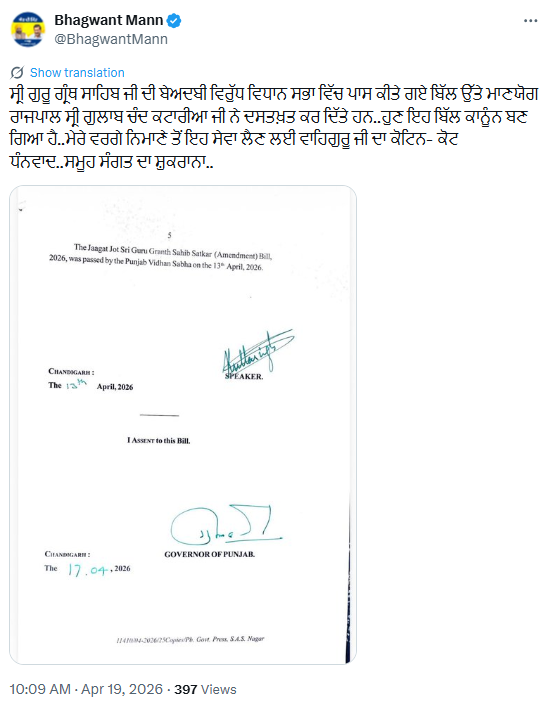 ਦੱਸ ਦਈਏ ਕਿ ਮੁੱਖ ਮੰਤਰੀ ਭਗਵੰਤ ਸਿੰਘ ਮਾਨ ਦੀ ਅਗਵਾਈ ਹੇਠ ਪੰਜਾਬ ਵਿਧਾਨ ਸਭਾ ਨੇ ਸ੍ਰੀ ਗੁਰੂ ਗ੍ਰੰਥ ਸਾਹਿਬ ਜੀ ਦੇ ਸਤਿਕਾਰ ਵਜੋਂ 13 ਅਪ੍ਰੈਲ ਨੂੰ ਸਰਬਸੰਮਤੀ ਨਾਲ ਜਾਗਤ ਜੋਤ ਸ੍ਰੀ ਗੁਰੂ ਗ੍ਰੰਥ ਸਾਹਿਬ ਸਤਿਕਾਰ (ਸੋਧਨਾ) ਬਿੱਲ, 2026 ਪਾਸ ਕਰ ਦਿੱਤਾ ਸੀ, ਜਿਸ ਨਾਲ ਗੁਰੂ ਸਾਹਿਬ ਦੀ ਬੇਅਦਬੀ ਲਈ ਸਖ਼ਤ ਸਜ਼ਾ ਦੀ ਵਿਵਸਥਾ ਕੀਤੀ ਗਈ ਹੈ। ਇਸ ਕਾਨੂੰਨ ਨੂੰ ਪਿਛਲੀਆਂ ਸਰਕਾਰਾਂ ਦੀਆਂ ਨਾਕਾਮੀਆਂ ਵਿੱਚ ਇਤਿਹਾਸਕ ਸੁਧਾਰ ਕਰਾਰ ਦਿੰਦਿਆਂ ਮੁੱਖ ਮੰਤਰੀ ਨੇ ਪੁਸ਼ਟੀ ਕੀਤੀ ਕਿ ਨਵਾਂ ਕਾਨੂੰਨ ਪਿਛਲੀਆਂ ਸਰਕਾਰਾਂ ਦੀਆਂ ਕਮੀਆਂ ਨੂੰ ਦੂਰ ਕਰਨ ਦੇ ਨਾਲ-ਨਾਲ ਤੇਜ਼ੀ ਨਾਲ ਜਾਂਚ ਯਕੀਨੀ ਬਣਾਉਂਦਾ ਹੈ, ਅਪਰਾਧਾਂ ਨੂੰ ਗੈਰ-ਜ਼ਮਾਨਤੀ ਬਣਾਉਂਦਾ ਹੈ ਅਤੇ ਪੰਜ ਸਾਲ ਤੋਂ ਲੈ ਕੇ ਉਮਰ ਕੈਦ ਤੱਕ ਸਖ਼ਤ ਸਜ਼ਾਵਾਂ ਦੇ ਨਾਲ-ਨਾਲ 20 ਲੱਖ ਰੁਪਏ ਤੱਕ ਦੇ ਜੁਰਮਾਨੇ ਦੀ ਵਿਵਸਥਾ ਕਰਦਾ ਹੈ, ਜਦੋਂ ਕਿ ਬੇਅਦਬੀ ਵਿੱਚ ਸਹਾਇਤਾ ਕਰਨ ਵਾਲਿਆਂ ਨੂੰ ਵੀ ਬਰਾਬਰ ਜਵਾਬਦੇਹ ਬਣਾਉਂਦਾ ਹੈ।