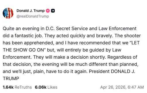 “ਵਾਸ਼ਿੰਗਟਨ ਵਿੱਚ ਇਹ ਇੱਕ ਬਹੁਤ ਹੀ ਰੁਝੇਵੇਂ ਵਾਲੀ ਸ਼ਾਮ ਸੀ। ਸੀਕ੍ਰੇਟ ਸਰਵਿਸ ਅਤੇ ਕਾਨੂੰਨ ਲਾਗੂ ਕਰਨ ਵਾਲੀਆਂ ਏਜੰਸੀਆਂ ਨੇ ਸ਼ਾਨਦਾਰ ਕੰਮ ਕੀਤਾ। ਉਨ੍ਹਾਂ ਨੇ ਤੇਜ਼ੀ ਨਾਲ ਕਾਰਵਾਈ ਕੀਤੀ। ਹਮਲਾਵਰ ਨੂੰ ਫੜ ਲਿਆ ਗਿਆ ਹੈ, ਅਤੇ ਮੇਰਾ ਸੁਝਾਅ ਹੈ ਕਿ ਅਸੀਂ ਇਸ ਪ੍ਰੋਗਰਾਮ ਨੂੰ ਜਾਰੀ ਰੱਖੀਏ,” ਟਰੰਪ ਨੇ ਇੱਕ ਸੋਸ਼ਲ ਮੀਡੀਆ ਪੋਸਟ ਵਿੱਚ ਲਿਖਿਆ।