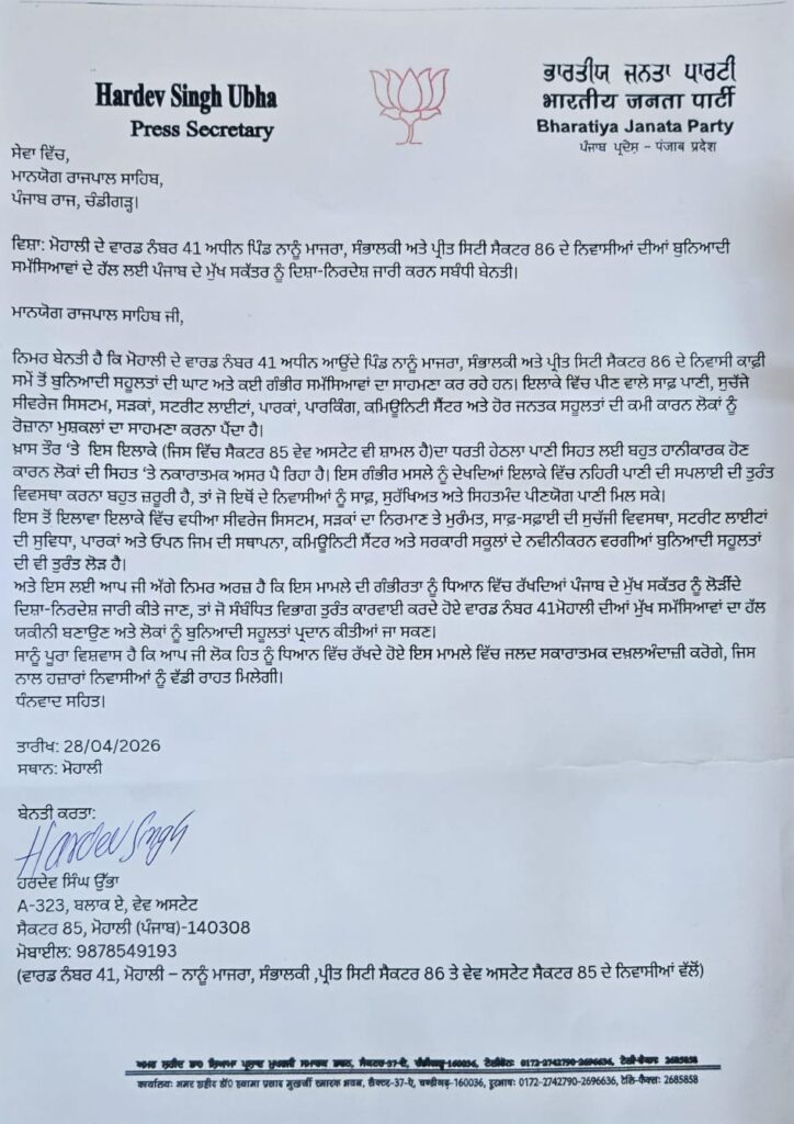 ਮੋਹਾਲੀ ਦੇ ਲੋਕ ਹਾਨੀਕਾਰਕ ਭੂਮੀਗਤ ਪਾਣੀ ਪੀਣ ਲਈ ਮਜਬੂਰ: ਹਰਦੇਵ ਸਿੰਘ ਉੱਭਾ ਚੰਡੀਗੜ੍ਹ, 28 ਅਪ੍ਰੈਲ, 2026: ਭਾਰਤੀ ਜਨਤਾ ਪਾਰਟੀ ਪੰਜਾਬ ਦੇ ਸੂਬਾ ਪ੍ਰੈਸ ਸਕੱਤਰ ਹਰਦੇਵ ਸਿੰਘ ਉੱਭਾ ਨੇ ਪੰਜਾਬ ਦੇ ਮਾਣਯੋਗ ਰਾਜਪਾਲ ਸ੍ਰੀ ਗੁਲਾਬ ਚੰਦ ਕਟਾਰੀਆ ਨੂੰ ਇੱਕ ਪੱਤਰ ਲਿਖ ਕੇ ਮੋਹਾਲੀ ਦੇ ਵਾਰਡ ਨੰਬਰ 41 ਅਧੀਨ ਆਉਂਦੇ ਪਿੰਡ ਨਾਨੂ ਮਾਜਰਾ, ਸੰਭਾਲਕੀ ਅਤੇ ਪ੍ਰੀਤ ਸਿਟੀ ਸੈਕਟਰ 86 ਦੇ ਵਸਨੀਕਾਂ ਦੀਆਂ ਲੰਬੇ ਸਮੇਂ ਤੋਂ ਚੱਲ ਰਹੀਆਂ ਮੁੱਢਲੀਆਂ ਸਮੱਸਿਆਵਾਂ ਦੇ ਹੱਲ ਲਈ ਤੁਰੰਤ ਦਖਲ ਦੇਣ ਦੀ ਮੰਗ ਕੀਤੀ ਹੈ। ਹਰਦੇਵ ਸਿੰਘ ਉੱਭਾ ਨੇ ਕਿਹਾ ਕਿ ਪਹਿਲਾਂ ਪੰਜਾਬ ਦੀ ਕਾਂਗਰਸ ਸਰਕਾਰ ਅਤੇ ਹੁਣ ਭਗਵੰਤ ਮਾਨ ਸਰਕਾਰ ਨੇ ਮੋਹਾਲੀ ਦੇ ਇਸ ਖੇਤਰ ਦੇ ਲੋਕਾਂ ਦੀਆਂ ਜਾਇਜ਼ ਮੰਗਾਂ ਅਤੇ ਮੁੱਢਲੀਆਂ ਸਹੂਲਤਾਂ ਵੱਲ ਕੋਈ ਗੰਭੀਰ ਧਿਆਨ ਨਹੀਂ ਦਿੱਤਾ। ਉਨ੍ਹਾਂ ਕਿਹਾ ਕਿ ਆਮ ਲੋਕ ਬਿਲਡਰਾਂ ਦੀਆਂ ਯੋਜਨਾਬੱਧ ਗਲਤੀਆਂ ਅਤੇ ਸਰਕਾਰੀ ਨਿਗਰਾਨੀ ਦੀ ਘਾਟ ਦਾ ਖਮਿਆਜ਼ਾ ਭੁਗਤ ਰਹੇ ਹਨ। ਇਲਾਕੇ ਦੇ ਹਜ਼ਾਰਾਂ ਪਰਿਵਾਰਾਂ ਕੋਲ ਅਜੇ ਵੀ ਸਾਫ਼ ਪੀਣ ਵਾਲਾ ਪਾਣੀ, ਇੱਕ