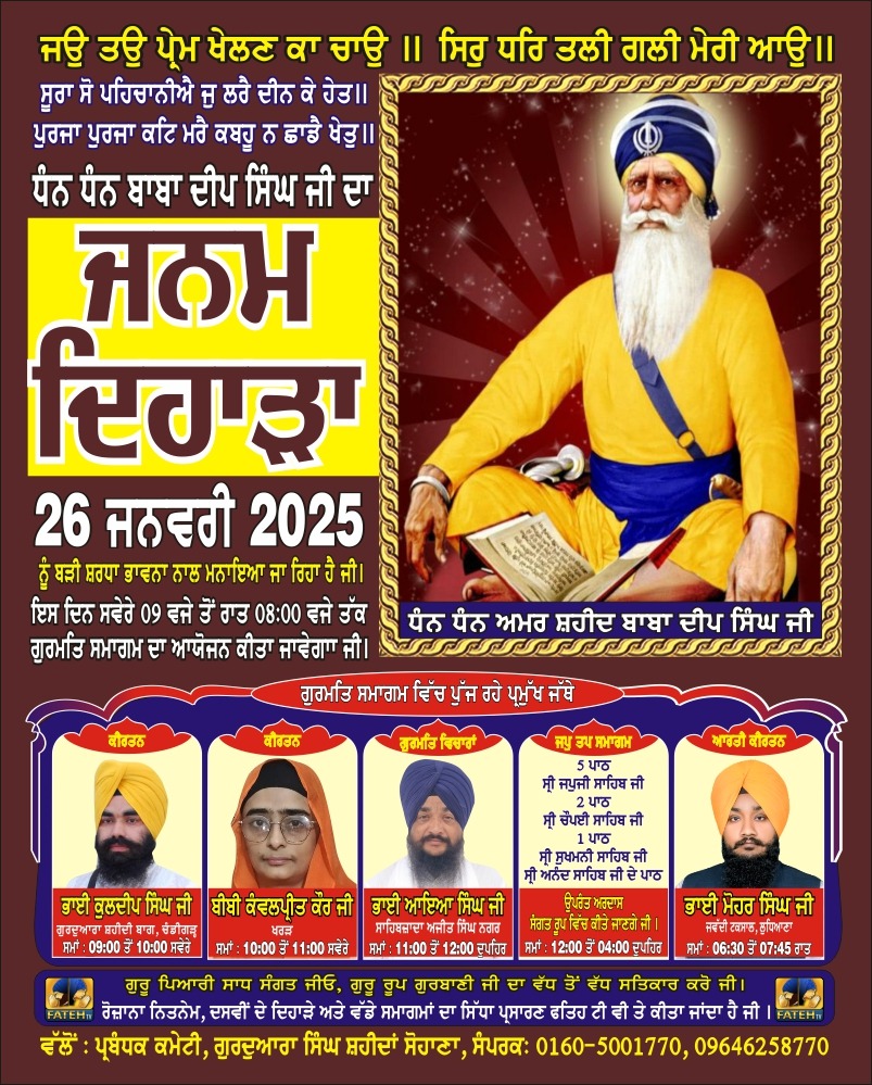 ਗੁ ਸਿੰਘ ਸ਼ਹੀਦਾਂ ਸੋਹਾਣਾ ਵਿਖੇ ਧੰਨ ਧੰਨ ਅਮਰ ਸ਼ਹੀਦ ਜੱਥੇਦਾਰ ਬਾਬਾ ਦੀਪ ਸਿੰਘ ਜੀ ਦਾ ਜਨਮ ਦਿਹਾੜਾ 26 ਜਨਵਰੀ ਨੂੰ